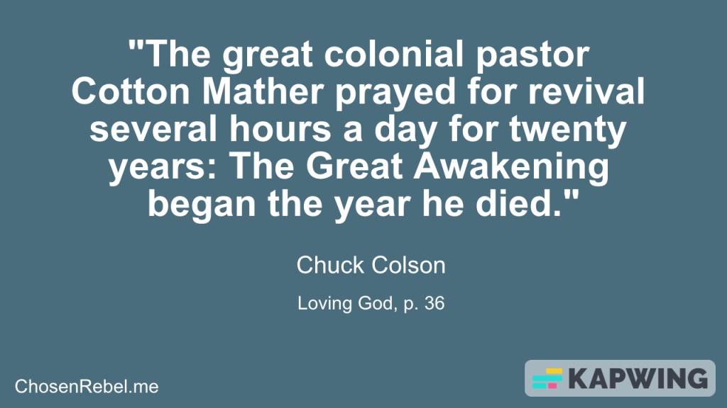 Let’s follow Cotton Mathers example, no matter how long it takes. Let’s give ourselves to prayer for the revival of the nation. He can do what none of us can. He can change the heart of men and women.